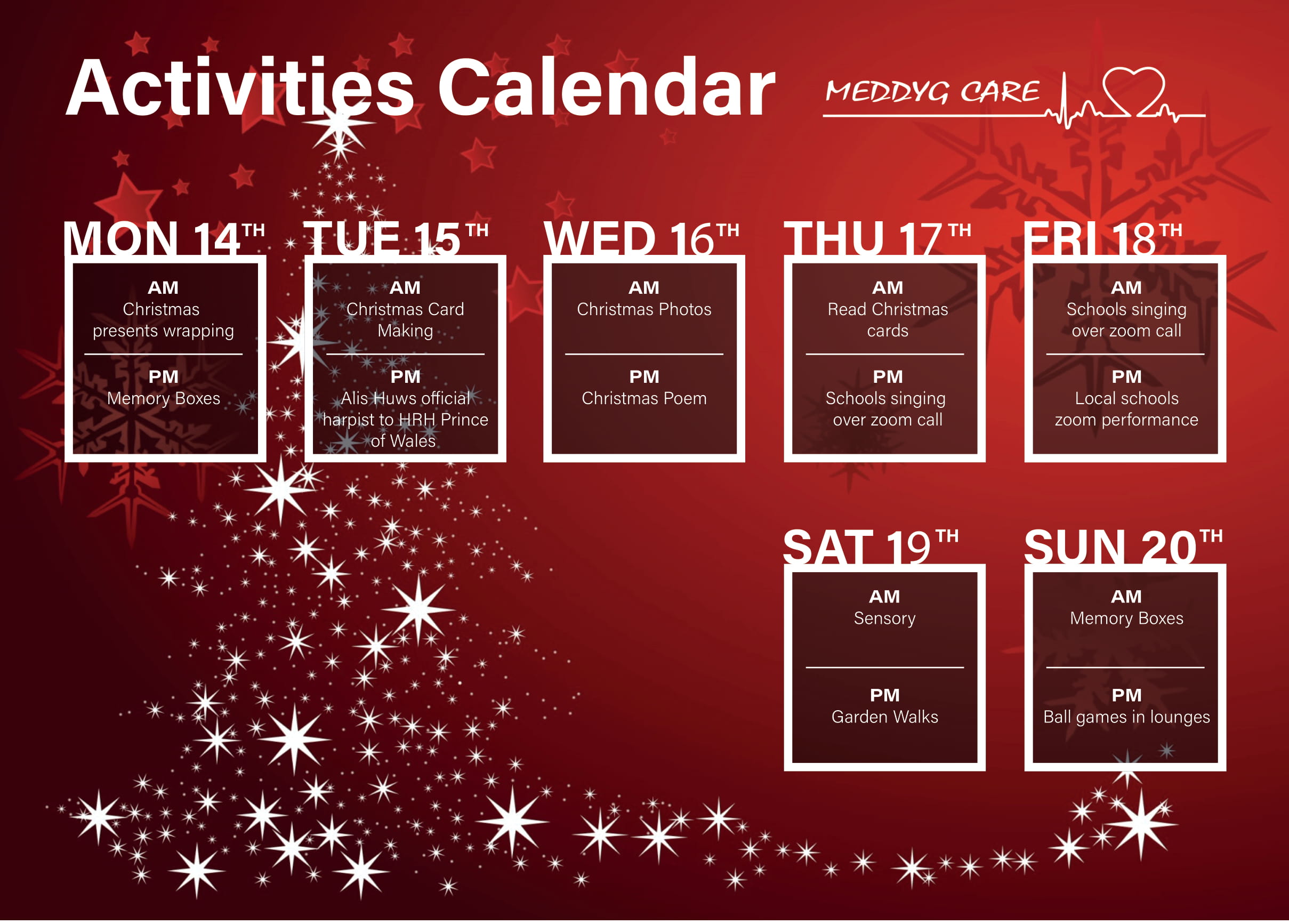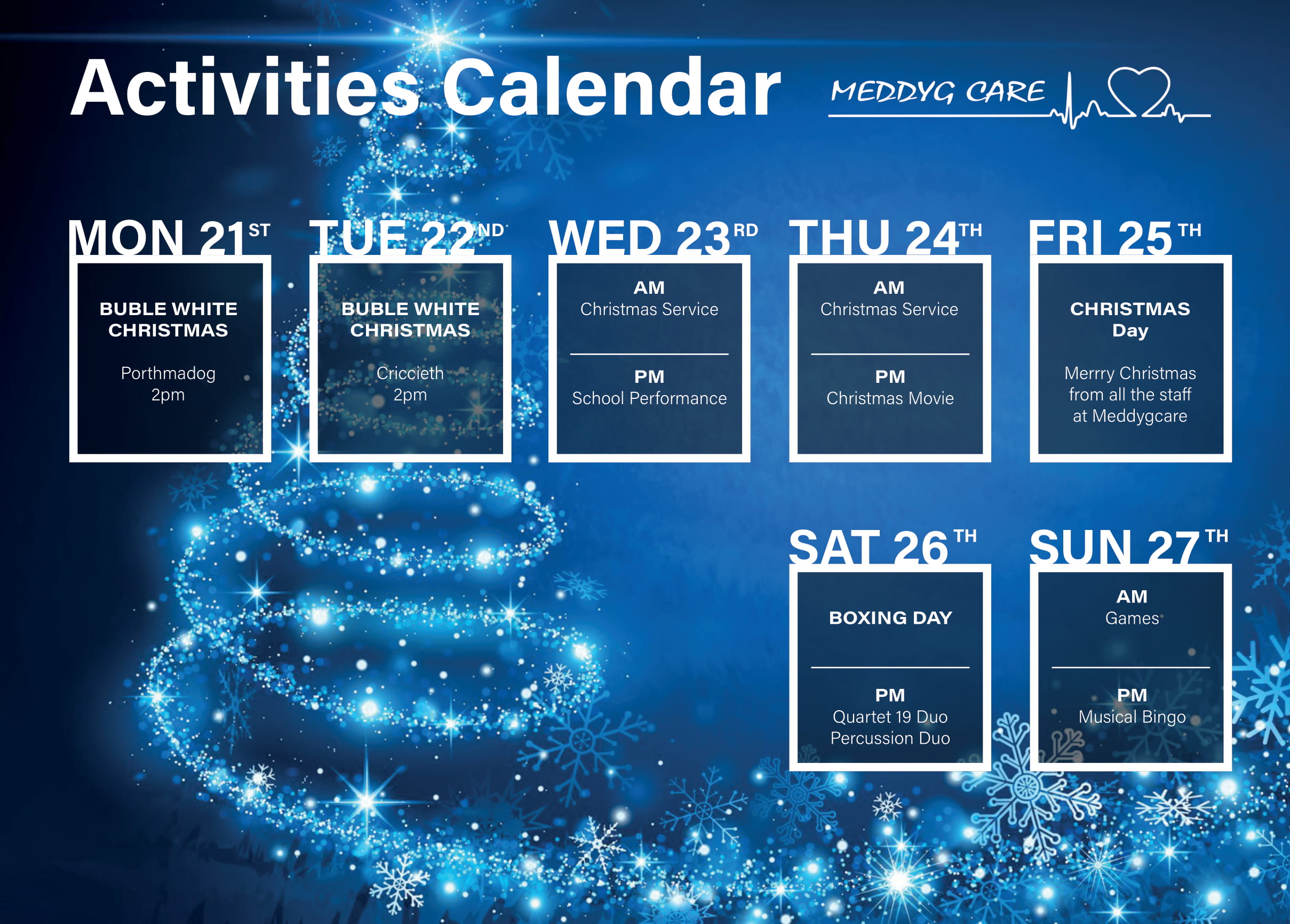 Meddyg Care has a packed calendar of activities over the festive period, with a great range of Christmas-themed events.  Kevin Edwards, Managing Director at Meddyg Care, said: “Our Christmas activities program at Meddyg Care will be fun-filled and very busy.”